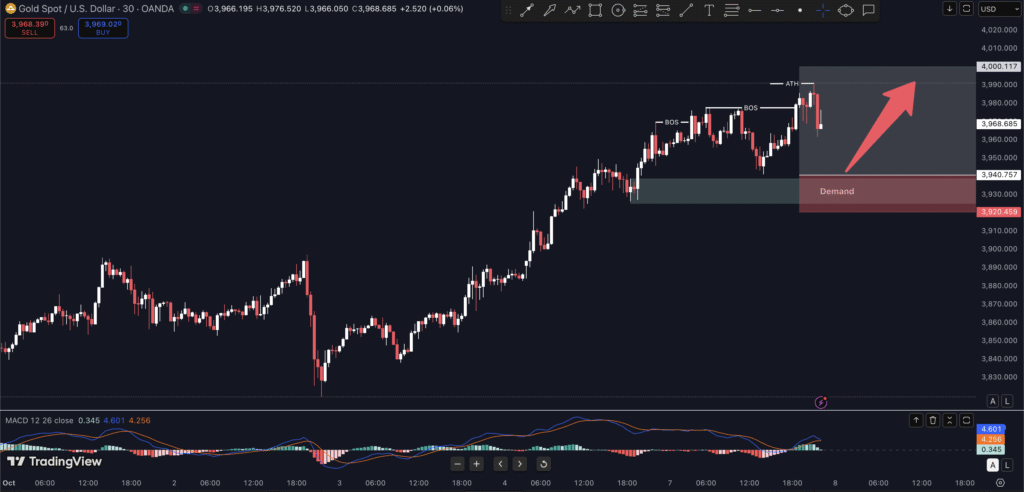 Near-Term Supply Zone (R1)$3,977 – $3,985Recent all-time high established on Oct 7; immediate high-probability profit-taking area.